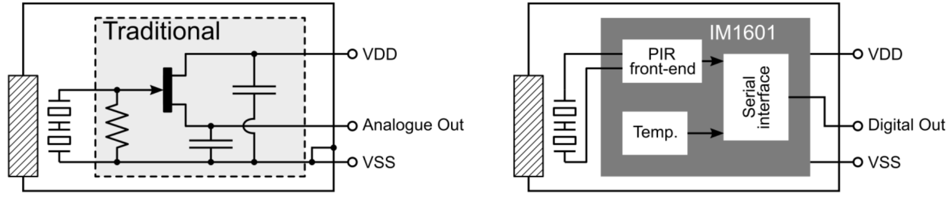 The IM1601 is a 3-pin device that provides a single digital line to read out a digital data stream accurately representing the PIR signal on a pyroceramic sensor element, including ambient temperature information obtained from an onboard temperature sensor. Data can be accessed either by using force read commands, or by relying on a chip-driven interrupt signal. The IM1601 is suited to applications where an external microcontroller accepts the digitised PIR and temperature signals and infers motion events using algorithms implemented on the microcontroller.