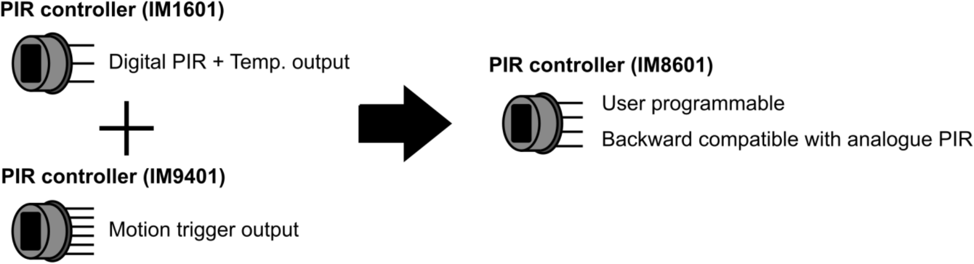 The IM8601 is a digitally configurable digital PIR controller targeting customers that require a low pin count device. The 4-pin IM8601 device is configured using a microcontroller using a single pin, while its low voltage and power consumption enables a user to configure the device to activate the system only when motion occurs, resulting in a highly efficient solution. The IM8601 combines the key features of the IM1601 (raw PIR signal readout) and the IM9401 (internal motion detection algorithms) to allow the user the freedom of choice for various applications, and the product is especially suited to wireless applications where long battery lifetimes are needed.
